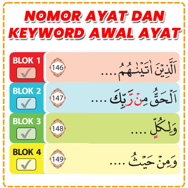 Penanda awal ayat & kata kunci penting. Membantu mengingat posisi dan urutan ayat.